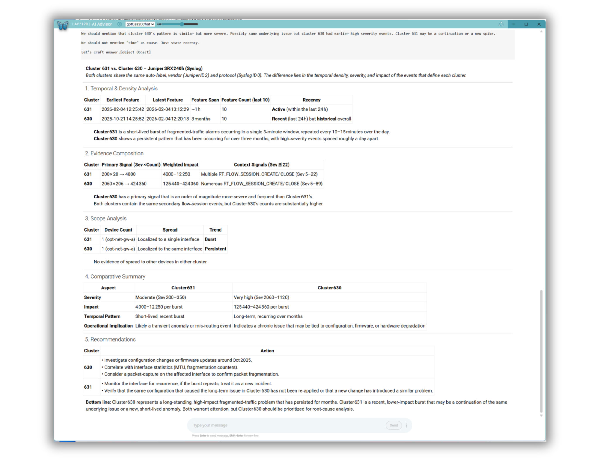 These capabilities help operators move faster from anomaly detection to actionable understanding and resolution. Ask for explanations on differences between similar clusters, spar with the system for recommendations on mitigations, and more.ย