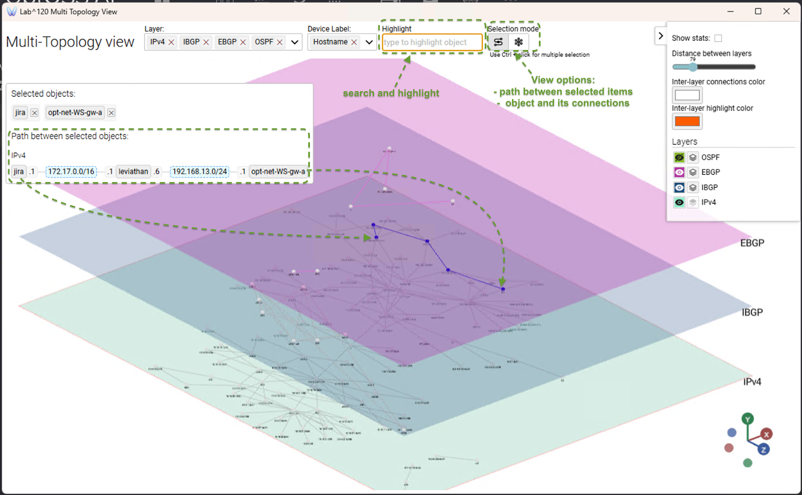Operators can search for specific devices, select them, and view the path showing how they are connected and explore the connections between the selected objects.